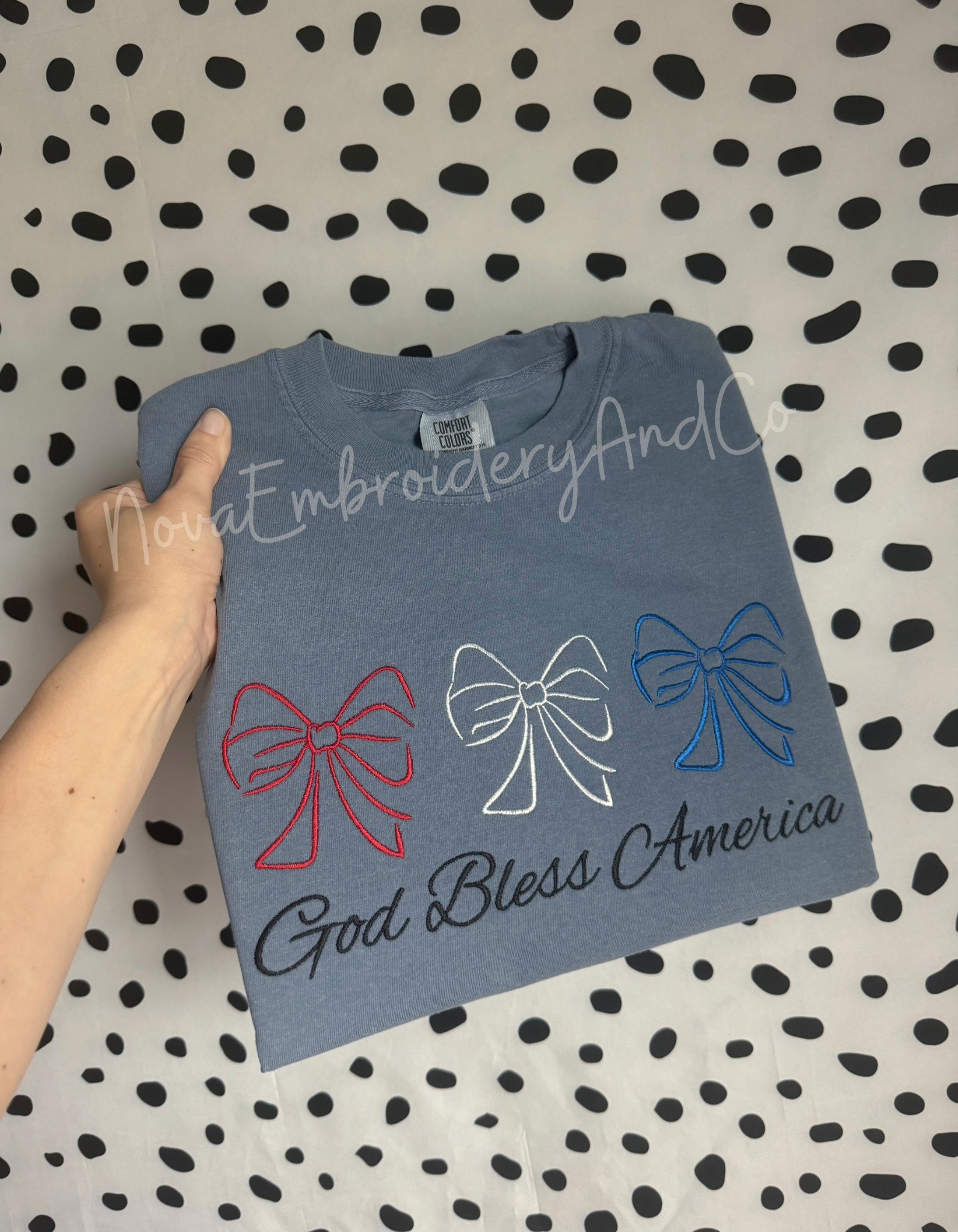 Embroidered Red White an Blue Bows on a comfort colors tee! This is the perfect simple tee to add to your collection for memorial day, 4th of July, or even just a basic everyday tee!